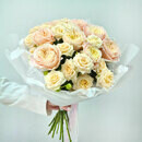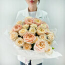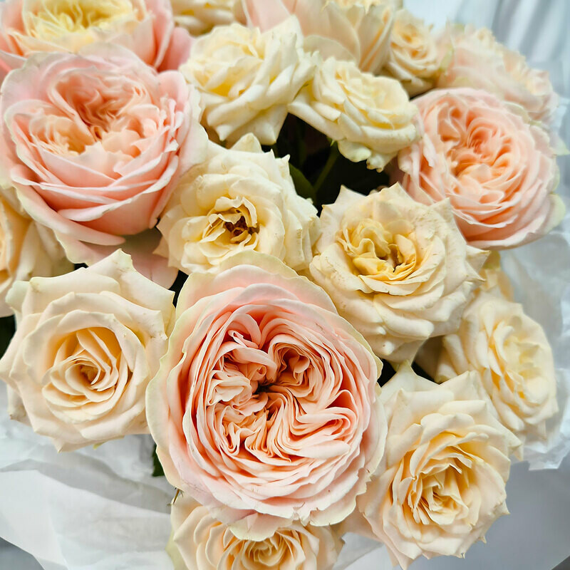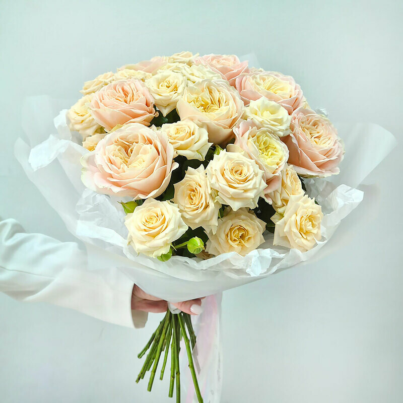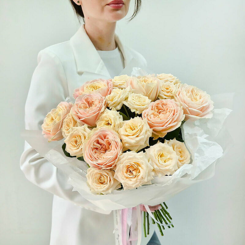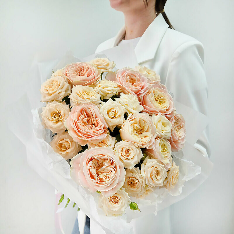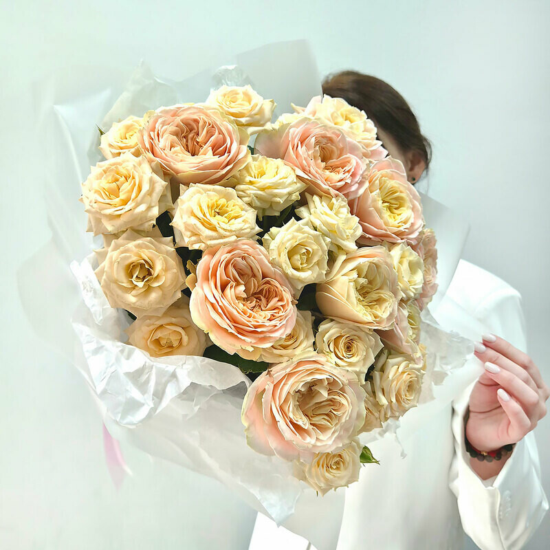 Dve pionovidnie rozi — dva ottenka odnoj nezhnosti. Kremovaya kustovaya roza darit buketu chistotu, vozdushnost_ i svet, a legendarnaya «Dzhul_etta» dobavlyaet tyoploe persikovo-abrikosovoe siyanie. Vmeste oni sozdayut igru polutonov — myagkuyu, utonchyonnuyu, beskonechno krasivuyu. Buket dlya zhenshini, ch_ya krasota govorit na yazike nezhnosti.