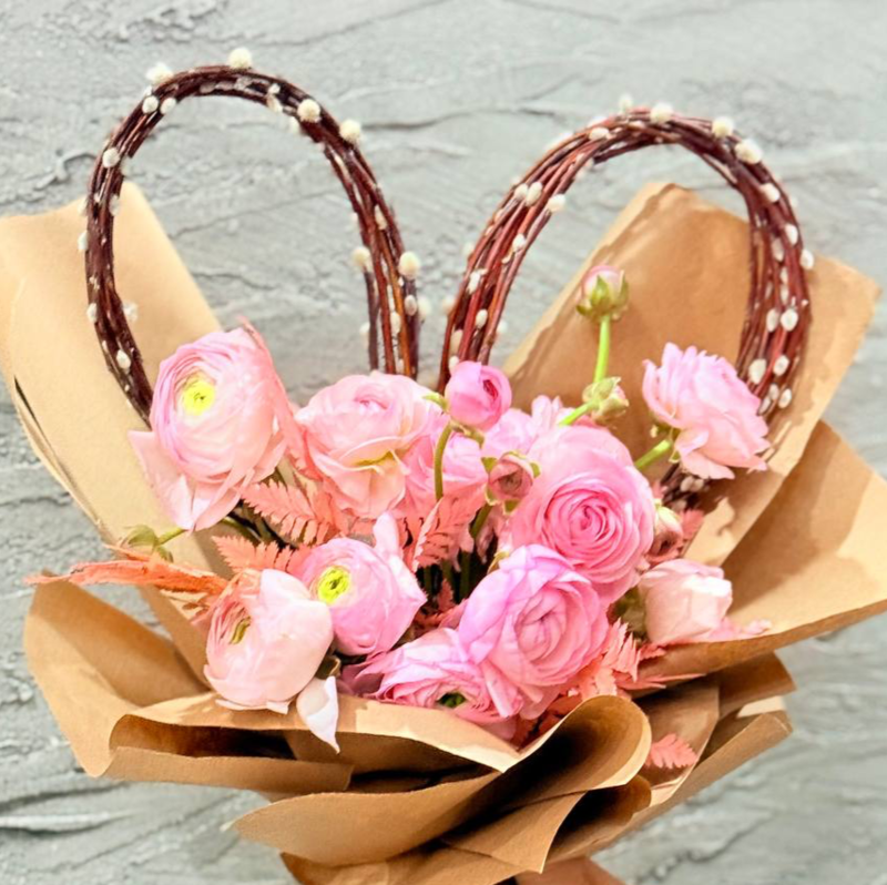Buket serdtce dlya lyubimoj devushki iz verbi, nezhnih ranunkulyus s vetochkami paporotnika