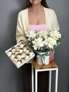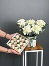 - Kompozitciya s frantcuzskimi rozami, evkaliptom i nabor klubniki v shokolade Creamy M