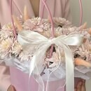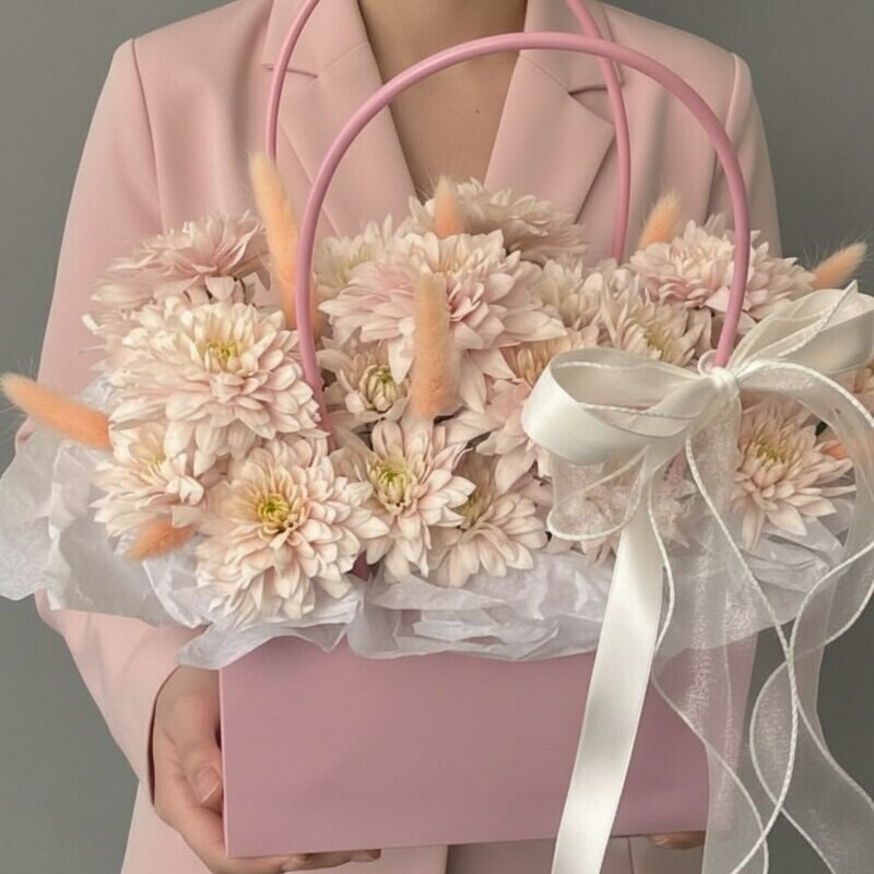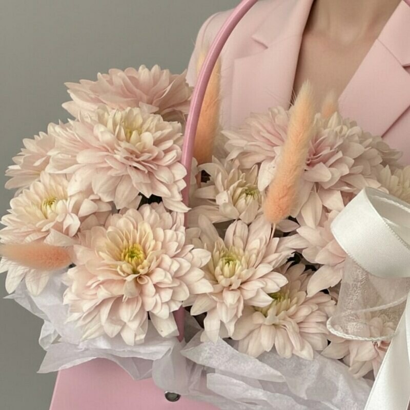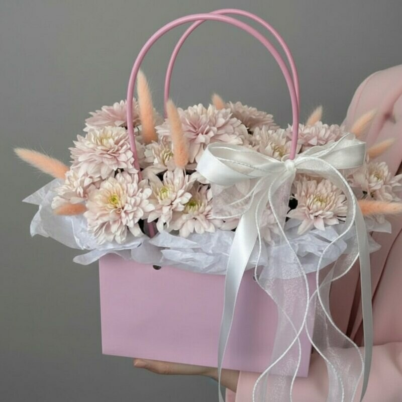 Kompozitciya v sumochke iz hrizantemi i lagurusa