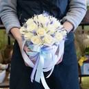 Kompozitciya v shlyapnoj korobke iz belih roz i suhotcvetov (lavandi i lagurusov).
