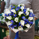 Buket iz belih kall, sinih irisov s dekorativnoj zelen_yu v dizajnerskoj bumage kraft.