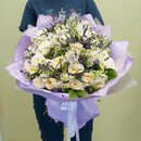 Buket tcvetov v nezhnih tonah iz pionovidnih belih roz, beloj sireni s dekorativnoj zelen_yu v podarochnoj upakovke.