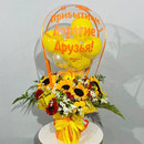 Podsolnuhi buket s sharom babls. Al_stromeriya, giperikum, tanatcetum, gerbera, santini, standart