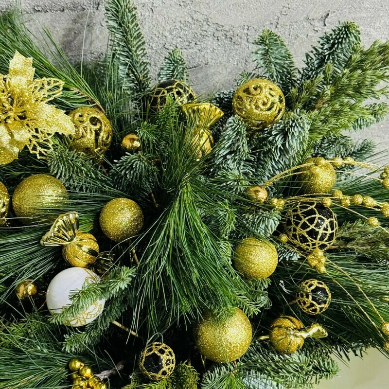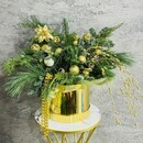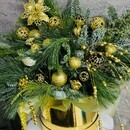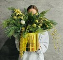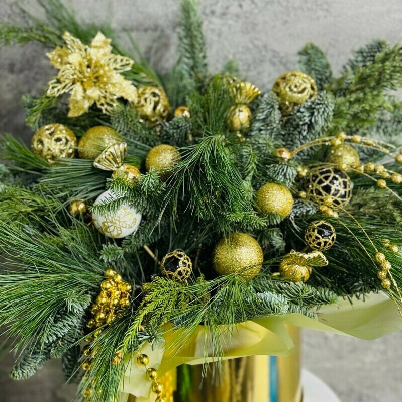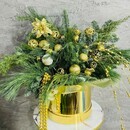 Zimnij buket, kompozitciya iz natural_noj hvoi nobilis, kiparis, mozhzhevel_nik v zolotoj korobke, standart
