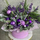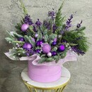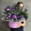 Novogodnij buket iz natural_noj hvoi nobilis, kiparis, mozhzhevel_nik v shlyapnoj korobke. Zimnij buket