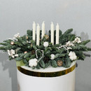 Krasivaya kompozitciya iz zhivogo, natural_nogo nobilisa, lapnika, pihti, so svechoj ili dekorom, pridast uyuta i tepla novogodnemu ili rozhdestvenskomu vecheru, sozdast atmosferu prazdnika.
