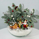 Vetochki nobilisa, s yolochnimi igrushkami, tematicheskimi novogodnimi figurkami, v steklyannom bokale, tematicheskim dekorom eto stil_noe i effektnoe oformlenie buketa.