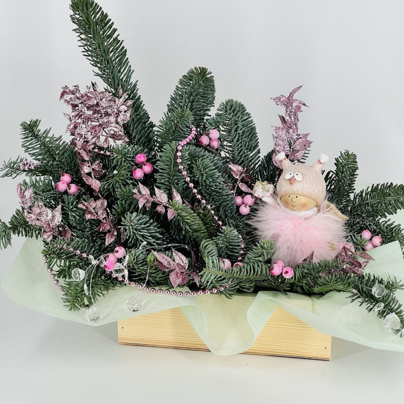 Vetochki nobilisa, s novogodnim dekorom i suvenirom v vide Angela v puhovom plat_e, v derevyannom kashpo, eto stil_noe i effektnoe oformlenie buketa.