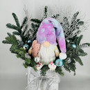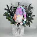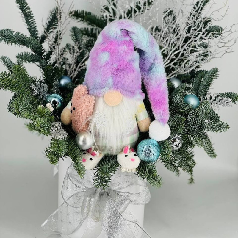 Vetochki nobilisa, s yolochnimi igrushkami v shlyapnoj korobke, v dopolnenii s inter_ernoj kukloj ruchnoj raboti, v vide gnoma, eto stil_noe i effektnoe oformlenie.