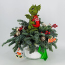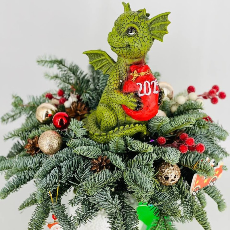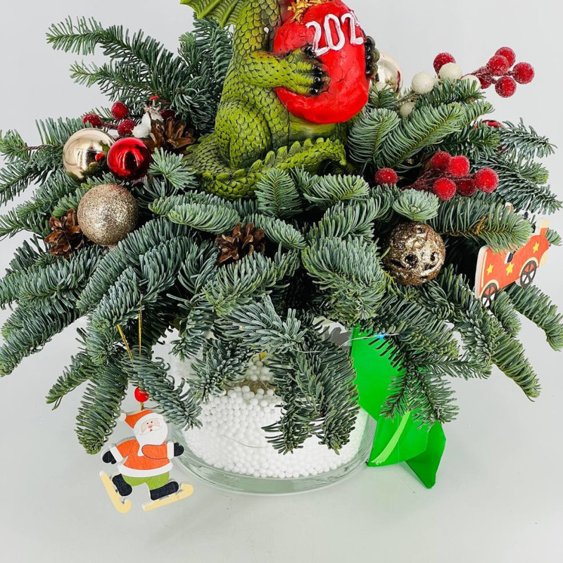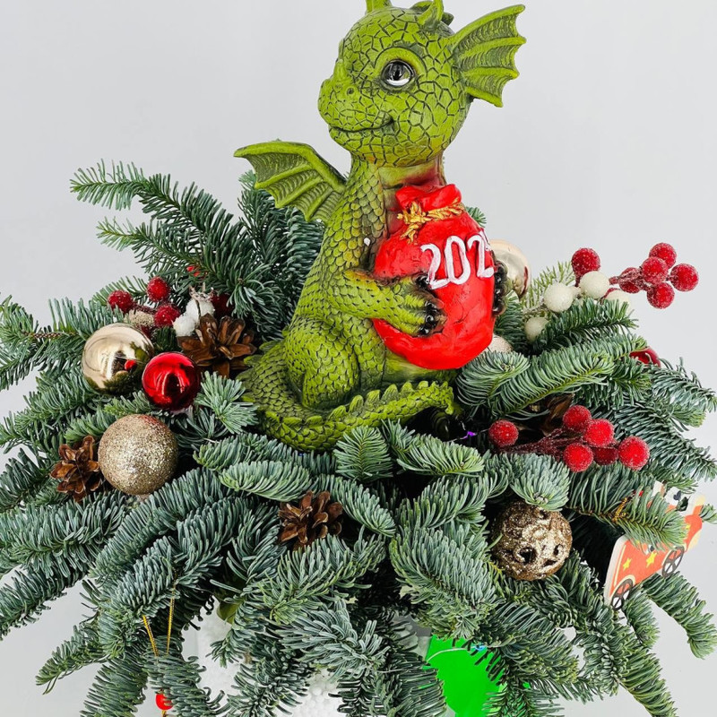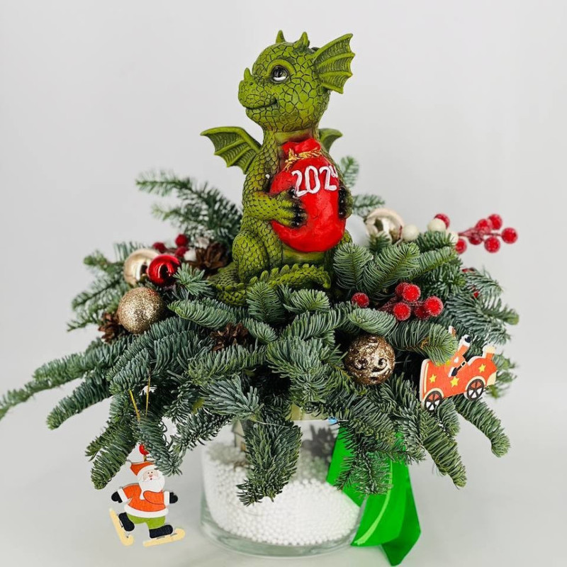 Novogodnij buket iz nobilisa v stekle s suvenirom "Drakon s meshkom podarkov", standart