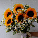 Buket s podsolnuhami smotritsya krasivo, yarko, original_no. V otlichie ot kompozitcij iz drugih tcvetov, oni smotryatsya neobichno, kazhdij raz po-novomu i svezho. Podsolnuh assotciiruetsya s solntcem, letom, teplom, poetomu vizivaet tol_ko polozhitel_nie emotcii. Buket podsolnuhov, stanet prostim, no pri etom elegantnim podarkom dlya pedagoga na den_ uchitelya, mami, zheni, lyubimoj devushki, dlya rukovoditelya. Otlichnij podarok na Den_ rozhdeniya, yubilej, 1 sentyabrya, Den_ znanij.
