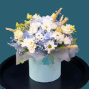 Pishnaya korobka v myagkih golubih i sinevatih ottenkah. Liziantus i hrizantema milo pereklikayutsya mezhdu soboj, sozdavaya polevoe nastroenie v kompozitcii vmeste s koloskami suhotcveta pshenitci. Vash ideal_nij buket v korobke dlya podnyatiya nastroeniya, svetlih pozhelanij i iskrennih namerenij!