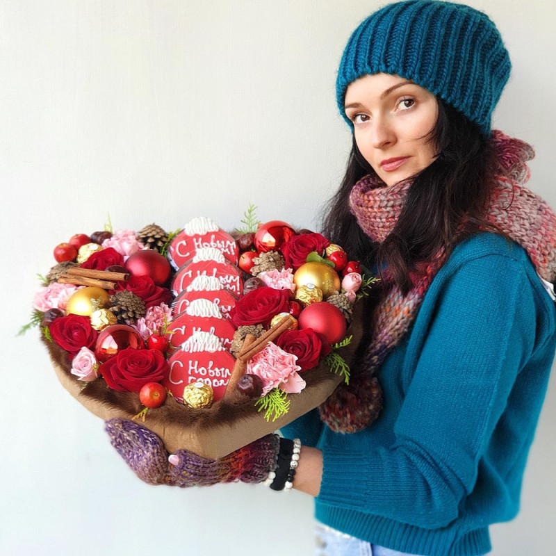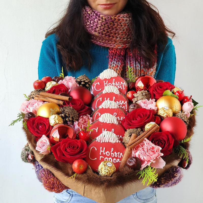 Bol_shaya kompozitciya s tcvetami, novogodnim dekorom i pesochnim pechen_em, standart