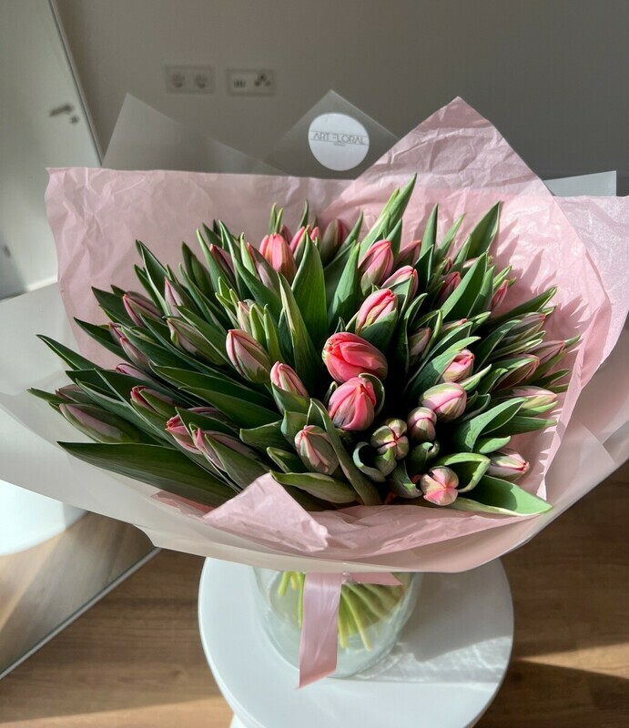 Myagkaya tcvetovaya gamma delaet etot buket iz tyul_panov ideal_nim viborom dlya dnej rozhdeniya, vesennih pozdravlenij, Dnya materi ili prosto kak trogatel_nij syurpriz bez povoda. Nezhno-rozovie tyul_pani simvoliziruyut simpatiyu, priznatel_nost_ i tonkie chuvstva — ideal_nij sposob virazit_ emotcii stil_no i so vkusom.