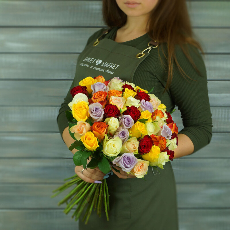 Buket iz 51 raznotcvetnoj rozi s lentoj Keniya 40 sm, standart