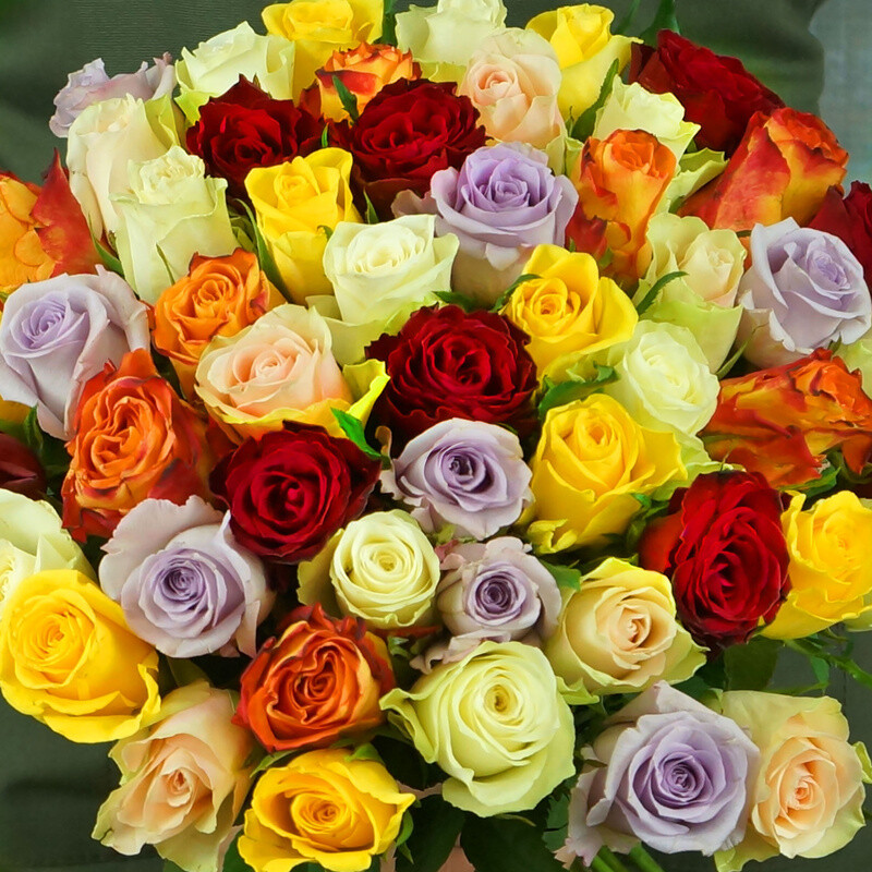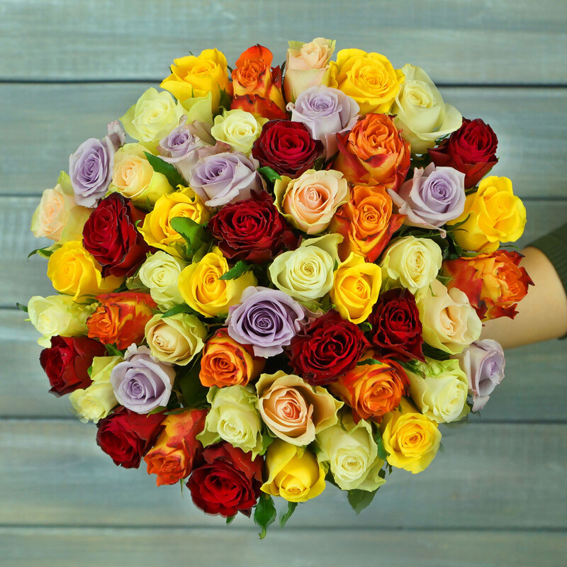 Buket iz 51 raznotcvetnoj rozi s lentoj Keniya 40 sm