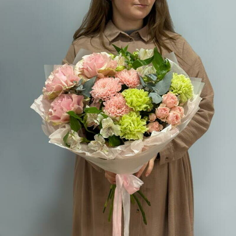 Nezhnij buket iz frantcuzskoj rozi, persikovoj hrizantemi i kustovoj rozi 118
