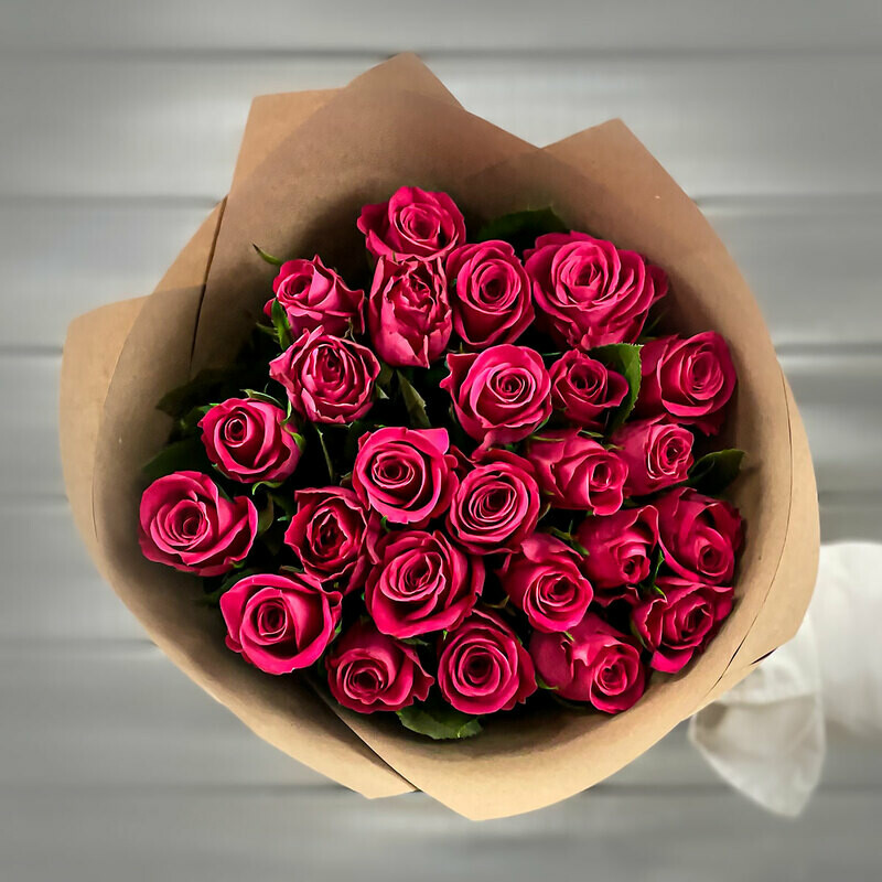 Buket iz 21 malinovoj rozi v krafte Keniya 40 sm., standart