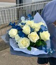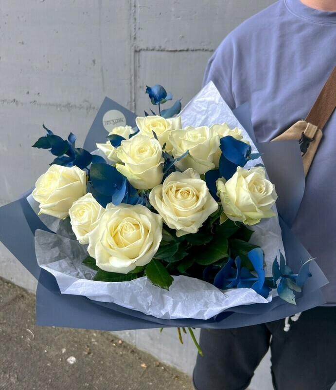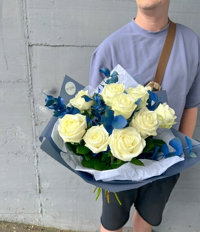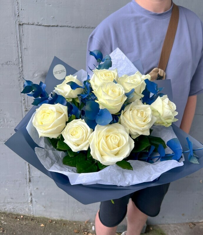 Sinij evkalipt dobavlyaet kompozitcii grafichnosti, smelosti i neveroyatnoj fakturnosti. Ego neobichnij ottenok podchyorkivaet bezuprechnuyu beliznu roz, zastavlyaya ih siyat_ eshyo yarche. Eto buket dlya teh, kto ne boitsya eksperimentov, tcenit sovremennij dizajn i hochet videlit_sya.