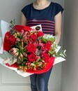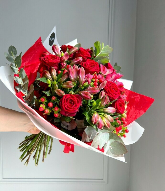 Etot buket — nastoyashaya simfoniya krasok, faktur i emotcij. V tcentre vnimaniya — blagorodnie krasnie rozi, simvol vsepogloshayushej strasti i glubokogo uvazheniya. Ih barhatistuyu pilkost_ podderzhivayut yarkie yagodi krasnogo giperikuma, slovno kapel_ki krovi, zastivshie v moment naivisshego schast_ya.