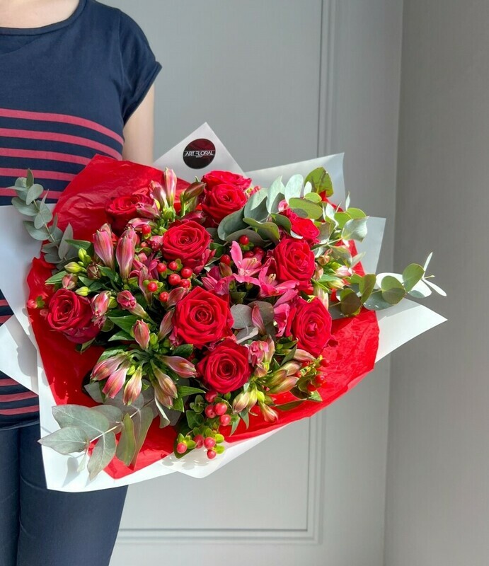 Nezhnaya rozovaya al_stromeriya vnosit v etu strastnuyu istoriyu notu trogatel_nosti, iskrennosti i zhenstvennosti. A serebristij evkalipt, kak vsegda, oblagorazhivaet kompozitciyu, dobavlyaya ej svezhest_, strukturu i tonkij, chut_ terpkij aromat. Eto buket-orkestr, gde kazhdij instrument igraet svoyu partiyu, sozdavaya edinuyu, velichestvennuyu melodiyu lyubvi.