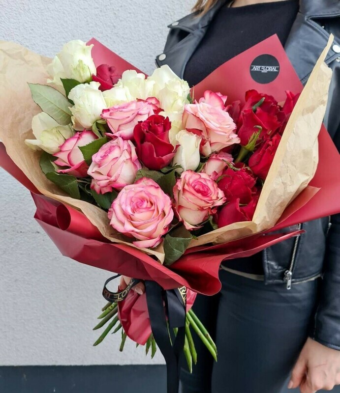 Lyubov_ mnogolika, i etot buket — eyo sovershennoe voploshenie. V odnoj kompozitcii soedinilis_ tri ottenka samogo blagorodnogo tcvetka v mire, chtobi rasskazat_ istoriyu nastoyashego, glubokogo chuvstva.