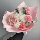 - Avtorskij buket s frantcuzskoj rozoj, hrizantemoj i rozovimi diantusami