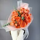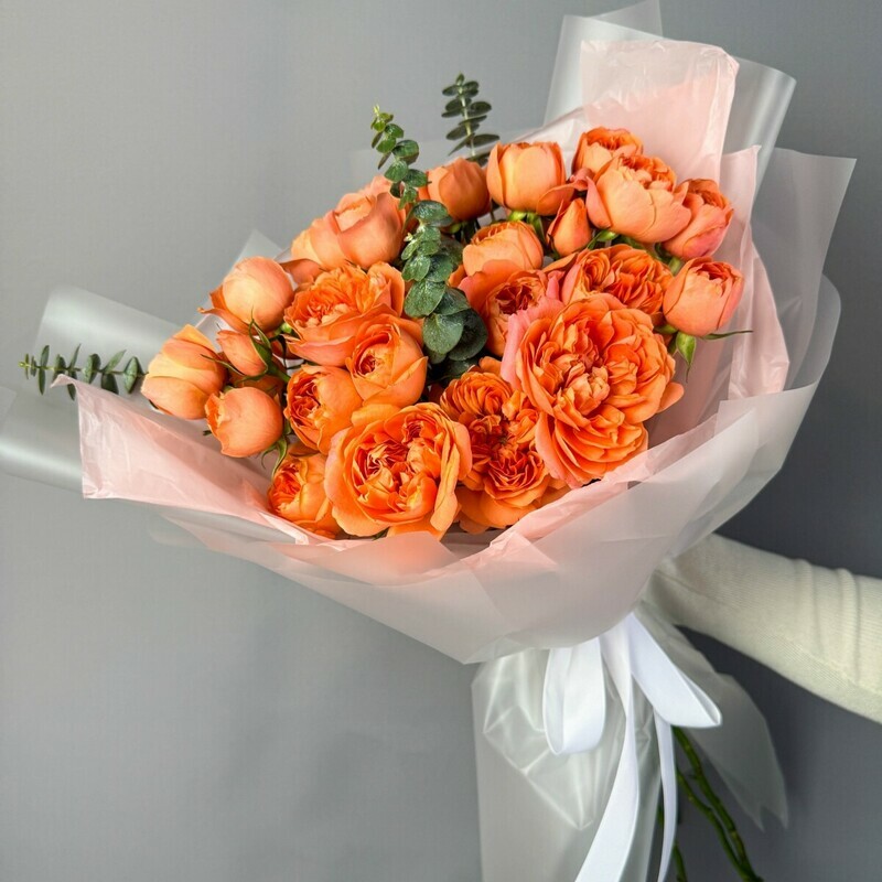 Buket kustovih pionovidnih roz. CHuvstvennie, effektnie, fotognenichnie butoni. Buton bol_shoj, s shikarnim raskritiem. Buket dopolnen trendovim evkaliptom bebi blyu i stil_noj, ne krichashej upakovkoj, kotoraya dopolnyaet krasotu tcvetov, ne ne peretyagivaet vnimanie na sebya.