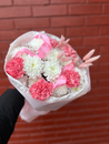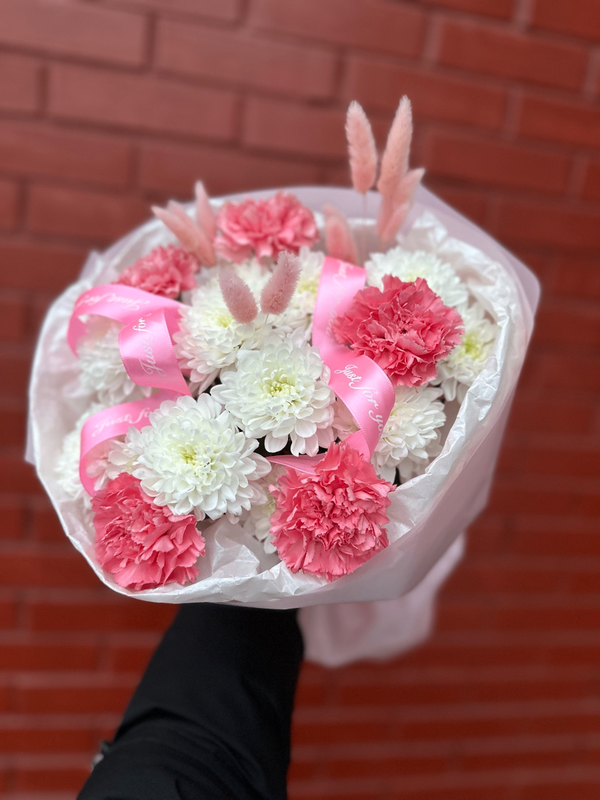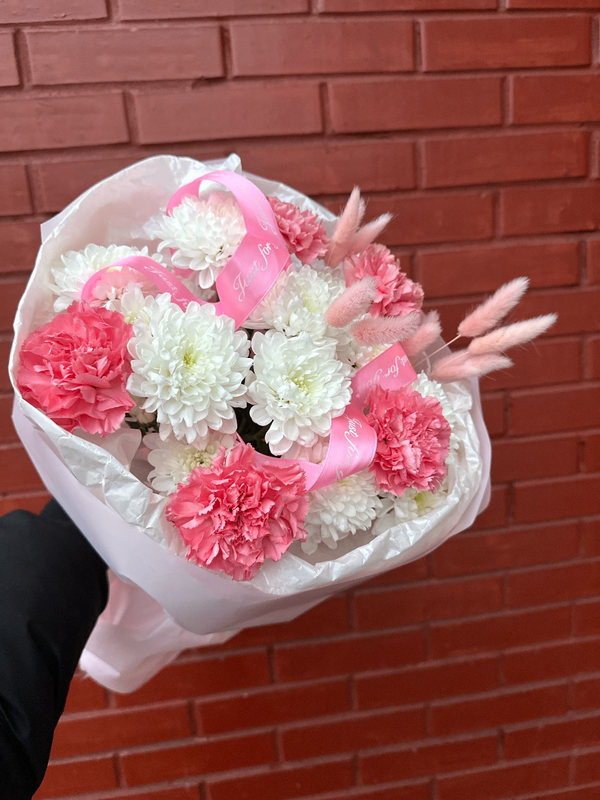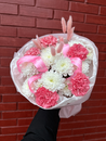 Milij buket s diantusami, hrizantemoj i lagurusami