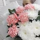 Buket iz belih kustovih hrizantem, evkalipta, i rozovih diantusov v matovoj plenke