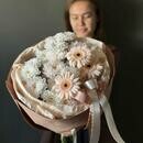 - Buket "Pudra" iz geber i kustovoj hrizantemi