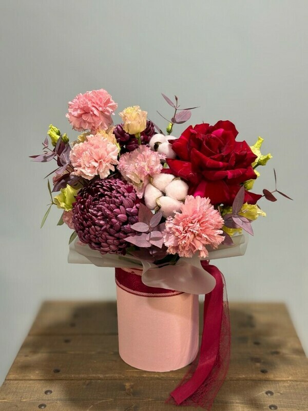 Kompozitciya dlya Mami iz hrizantemi, diantusa i krasnoj rozi 049, standart