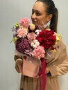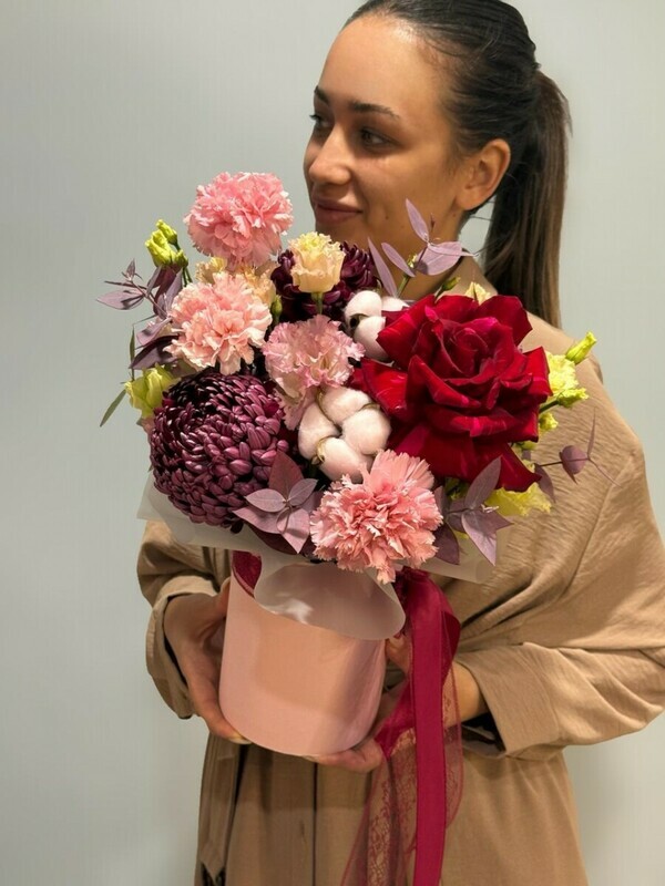 Kompozitciya dlya Mami iz hrizantemi, diantusa i krasnoj rozi 049