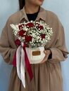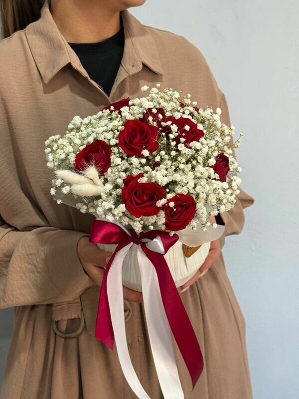 Vmeste kustovaya roza i gipsofila obrazuyut garmonichnij soyuz, v kotorom sila i nezhnost_, strast_ i smirenie slivayutsya voedino. Eta tcvetochnaya kompozitciya - prekrasnij sposob virazit_ vse te chuvstva, kotorie inogda tak slozhno peredat_ slovami. Ona stanet nezhnim napominaniem o vashej lyubvi i zabote, i obyazatel_no sogreet serdtce vashej mami v lyuboe vremya goda.