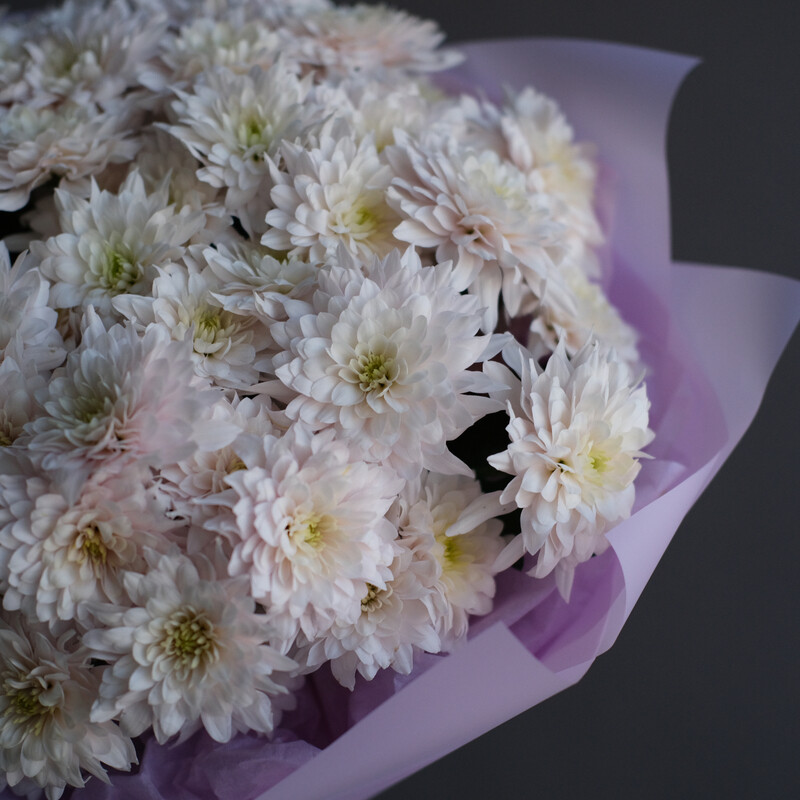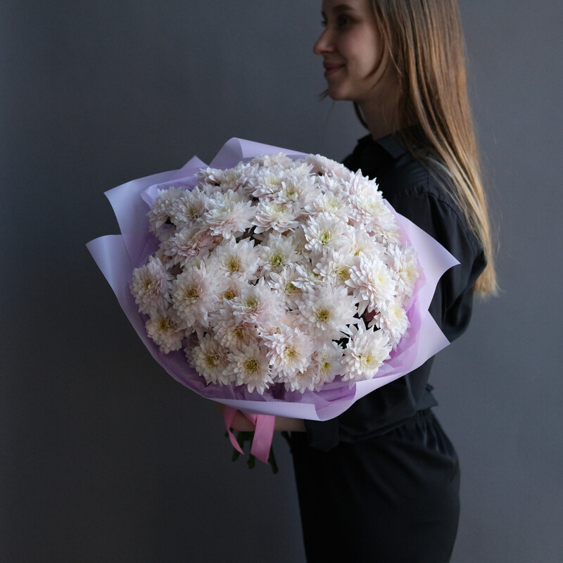 Nezhnie hrizantemi sorta Pastel_ sobrani v vozdushnij monobuket — simvol iskrennosti, tepla i lyogkih chuvstv. Universal_nij podarok, kotorij poraduet v lyuboj den_.