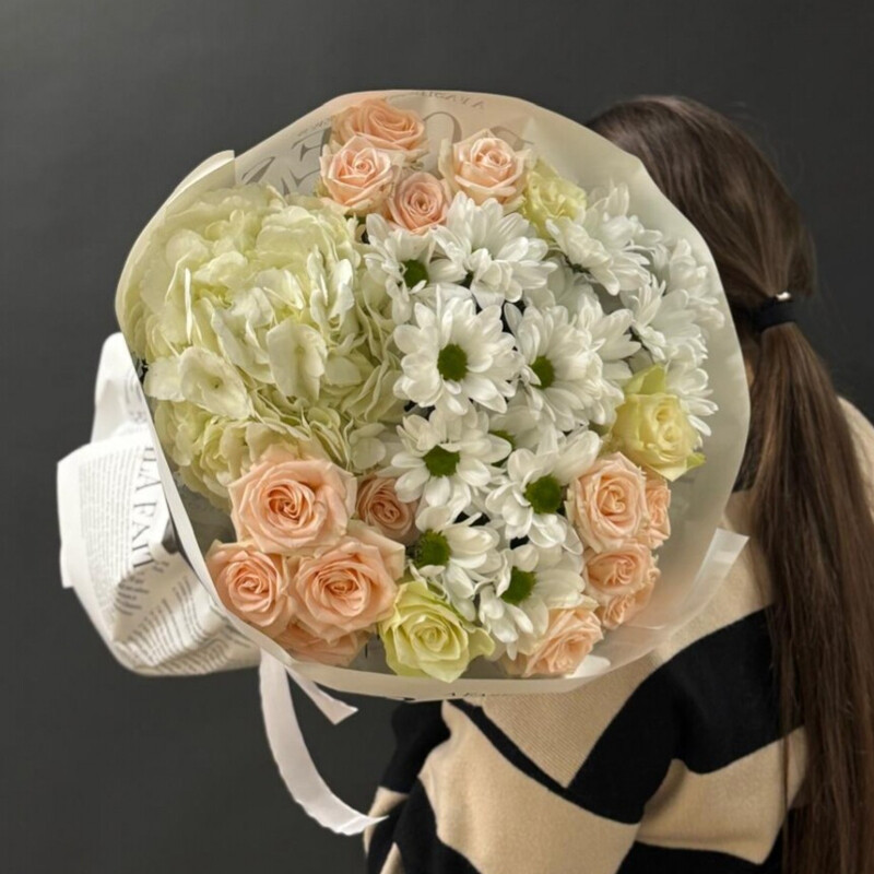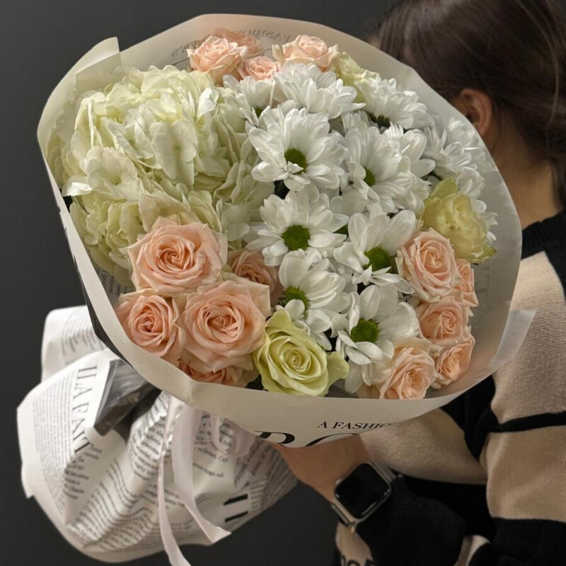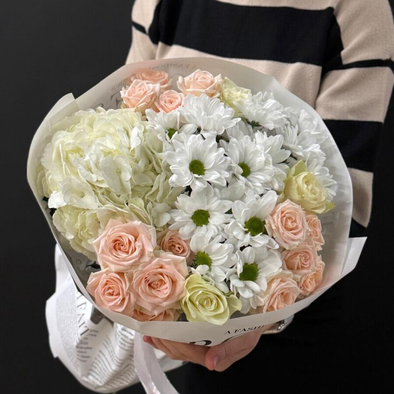 Buket iz hrizantem kustovih roz i gortenzii, standart
