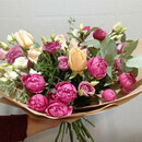 - Buket s pionovidnoj rozoj i eustomoj