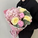 - Buket iz rozovoj gortenzii, belih roz i hlopka