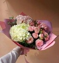 - Buket s gortenziej, kustovoj rozoj i diantusami