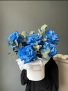 Kompozitciya v shlyapnoj korobke s sinimi rozami