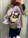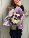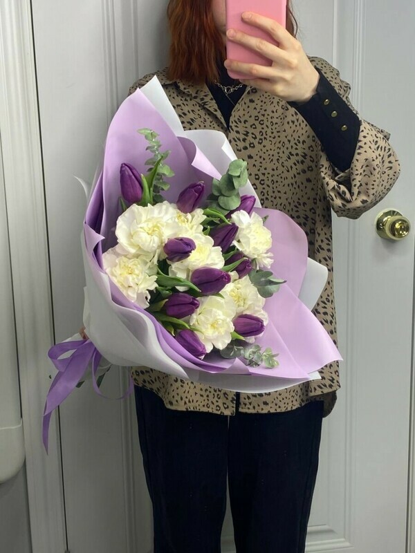 Glubina i nezhnost_. Roskosh_ fioletovih tyul_panov, oznachayushih korolevskoe ocharovanie i bezuslovnuyu lyubov_, smyagchena nevinnoj chistotoj belih diantusov. Kontrastnij duet, v kotorom est_ i sila chuvstv, i svetlaya trepetnost_. Buket, kotorij govorit: «Ti voshititel_na i nepovtorima».