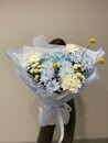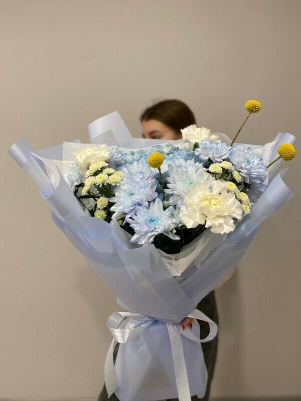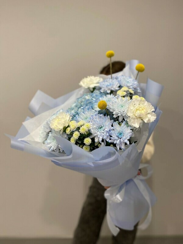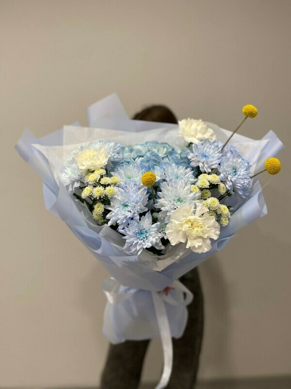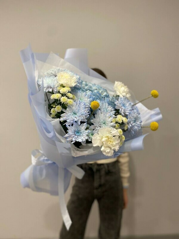 Ob_emnij sovremennij buket, gde nezhnie oblaka belih diantusov i barhatnie shari goluboj gortenzii vstrechayutsya s vozdushnimi hrizantemami. A smelij aktcent — solnechnie shariki kraspedii — dobavlyaet kompozitcii dinamiki i tepla. Ideal_nij podarok dlya yarkoj i tvorcheskoj lichnosti.
