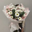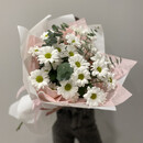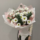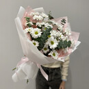 Solnechnie iskri romashkovih hrizantem v obramlenii prohladnoj serebristoj zeleni evkalipta. Etot buket pahnet letnim utrom, chistotoj i bezmyatezhnim schast_em. Prosto, svezho, ot dushi.