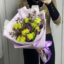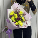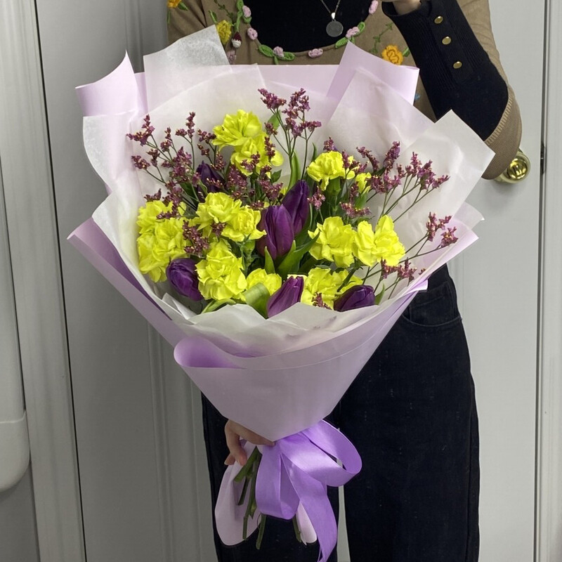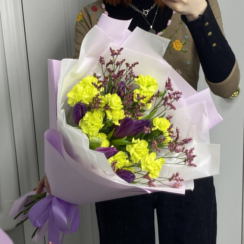 Probuzhdenie vesni v odnom bukete! Sochetanie glubokih fioletovih tyul_panov, solnechnih zhyoltih diantusov i vozdushnogo limoniuma sozdayot neveroyatnuyu garmoniyu kontrasta i nezhnosti. Etot buket — slovno pervij luch solntca, probivayushijsya skvoz_ utrennij tuman v lavandovom pole. On govorit o voshishenii, nadezhde i yarkoj radosti zhizni.