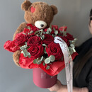 SHikarnaya kompozitciya iz krasnih roz s evkaliptom i igrushkoj. Stanet prekrasnim podarkom kak dlya lyubimoj, tak i dlya rebenka