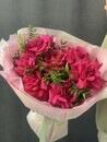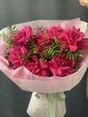 Buket viglyadit kak legkoe, pushistoe oblako, kotoroe vnezapno vspihnulo yarkim, nasishennim svetom. Nesmotrya na glubinu tcveta fuksii, on ne kazhetsya tyazhelim — blagodarya neobichnoj fakture glavnih tcvetov sozdaetsya oshushenie dvizheniya i nevesomosti.