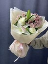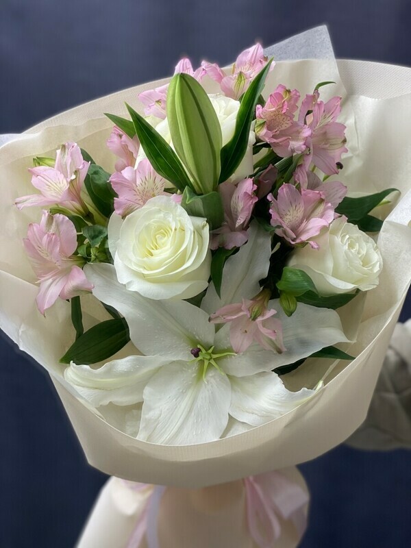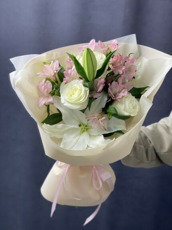 Etot buket — voploshenie nezhnosti, chistoti i izyashestva. Kompozitciya stroitsya na kontraste formi i plavnom perehode ottenkov.