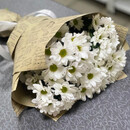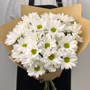 Buket-kompliment iz romashkovih hrizantem pokoryaet i vizivaet ulibku.
