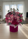 Izyashnaya tcvetochnaya kompozitciya v stil_noj korobke nasishennogo fuksievogo ottenka — voploshenie elegantnosti i utonchyonnosti. Buket stanet roskoshnim ukrasheniem inter_era ili iziskannim podarkom dlya osobennogo cheloveka.